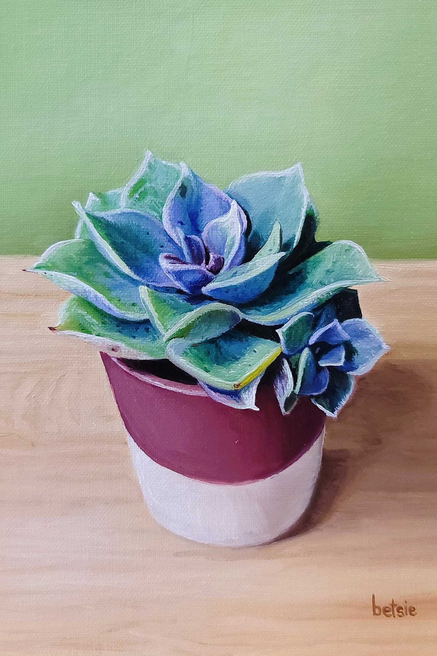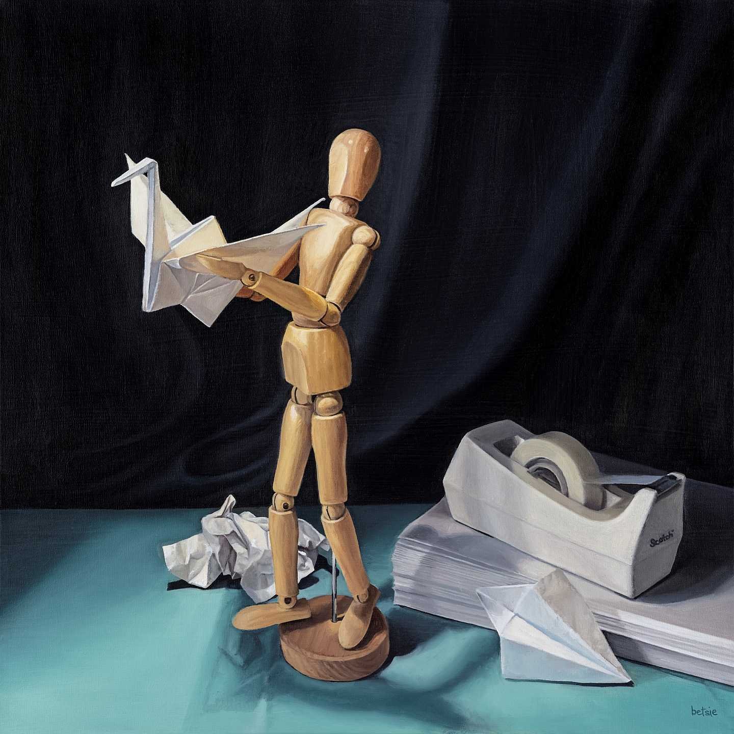 When not painting, Betsie makes a mockery of dancing and baking with her nine-year-old daughter, runs in the foothills, plays piano, camps, backpacks and travels with her family, meditates, and reads novels by the wood burning stove in her creaky old house.